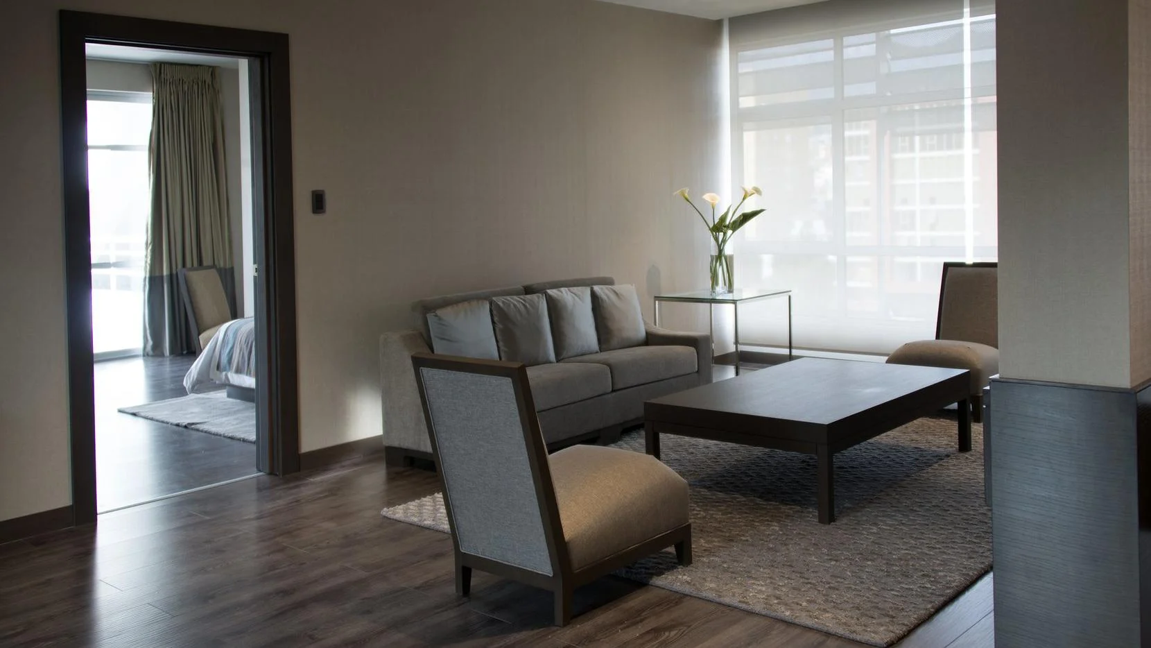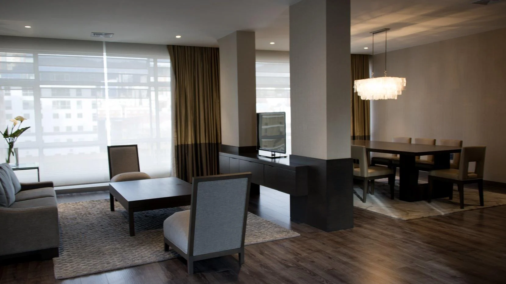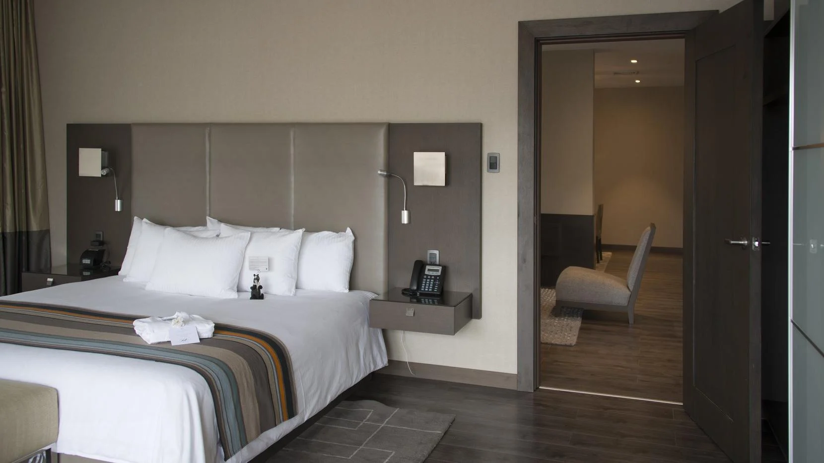 Con capacidad para una o dos personas, esta habitación de 122 metros cuadrados está equipada con un dormitorio con una cama King, una amplia sala de estar, un comedor de ocho personas, una terraza privada con mesa y sillas y dos baños, uno con Ducha efecto lluvia y bañera de hidromasaje y un escritorio de trabajo.